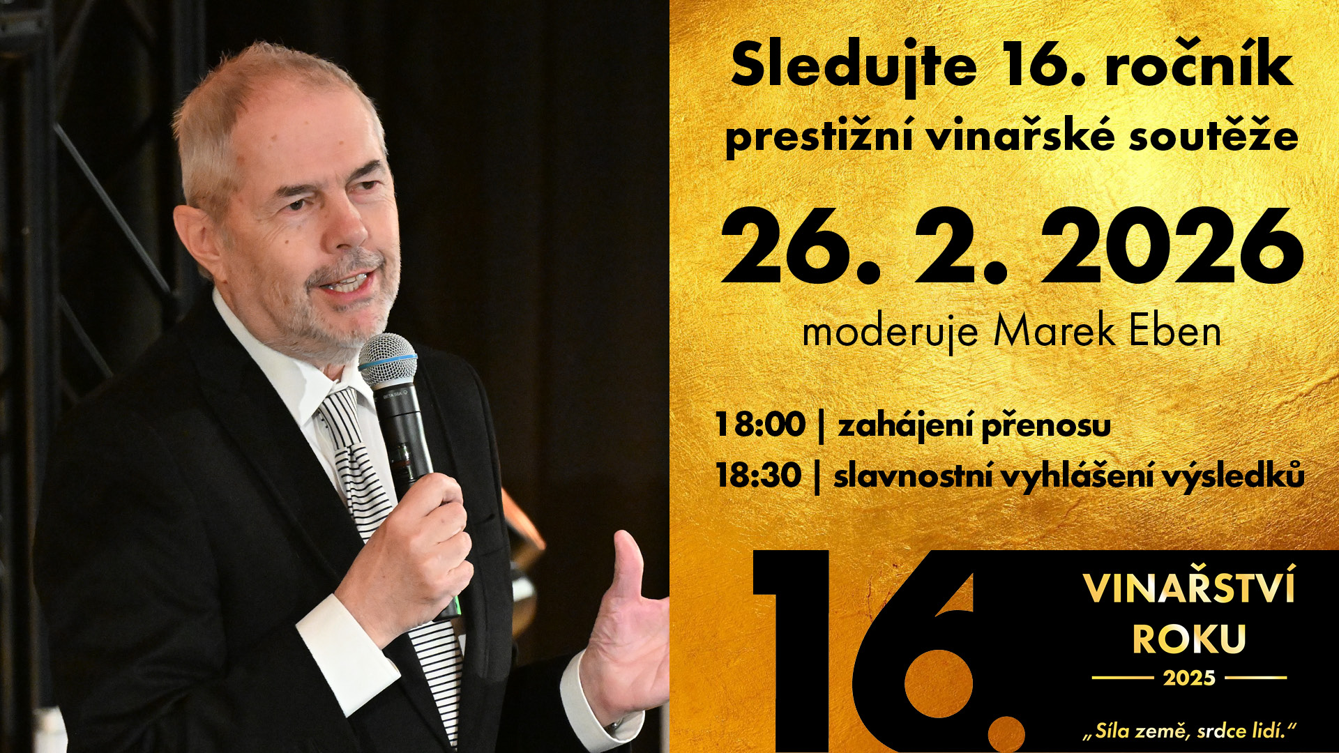 O tom, které ze šestice vinařství se stane absolutním vítězem, bude jasno již 26. února 2026. Slavnostním večerem v pražském studiu CNN Prima News provede přítomné hosty i diváky streamu moderátor Marek Eben.